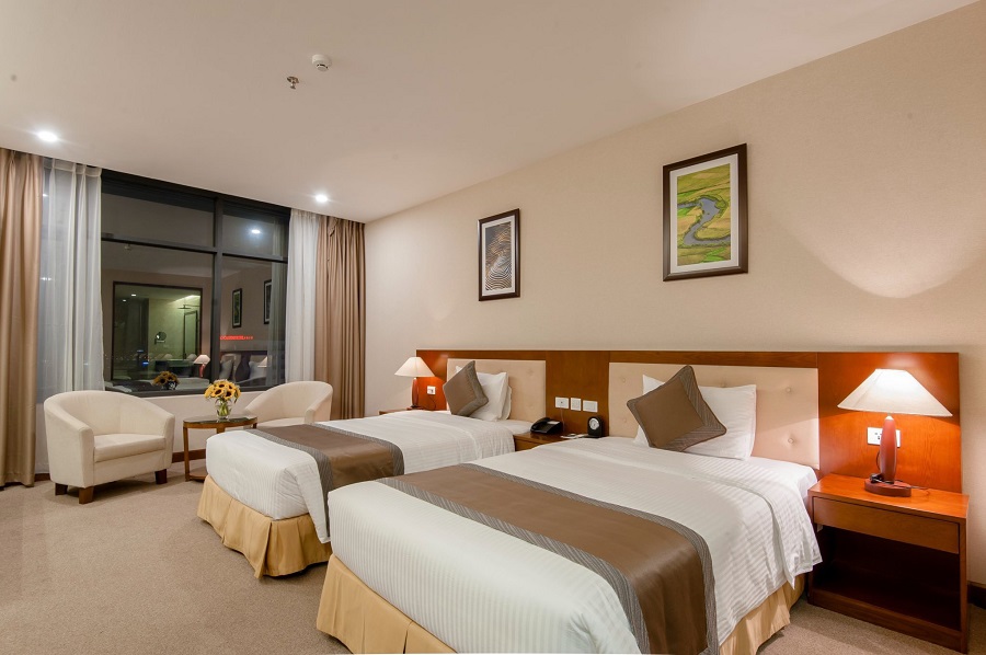 Trong phòng được khéo léo bố trí với 02 chiếc giường đơn cao cấp, bàn làm việc, tủ quần áo và ghế ngồi để du khách có thể ngắm phong cảnh của thành phố.