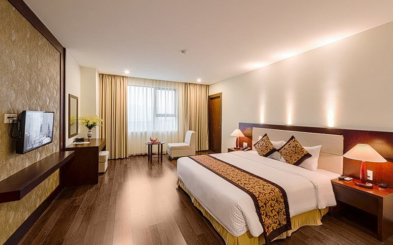 Phòng có diện tích 32m2, phòng có 1 giường king cỡ lớn 1,8m x 2m, trang thiết bị tiện nghi theo tiêu chuẩn 4 sao phục vụ lưu trú khách du lịch. Phòng có cửa sổ hướng thành phố hoặc bể bơi.